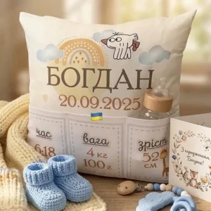 Personalisierung: Wir bringen die Geburtsdaten und den Namen des Kindes per Thermotransferdruck auf, was das Kissen zu einem einzigartigen Dekorationselement macht. Es passt perfekt auf das Sofa, den Sessel oder direkt ins Babybettchen.